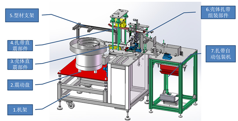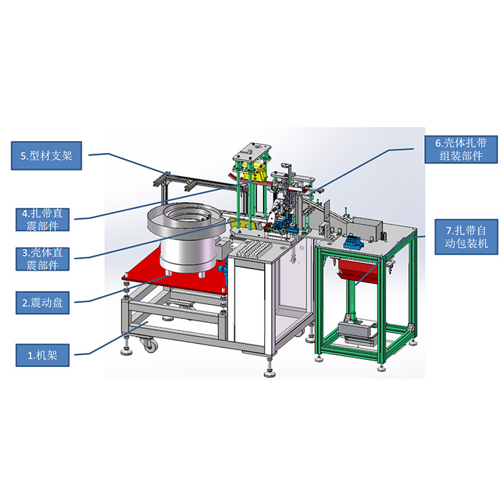 1.人工將扎帶放入軌道 2.圓振直振送料 3.殼體搬運 扎帶搬運 4.汽車卡扣扎帶自動組裝 5.成品排料 |