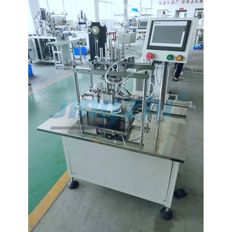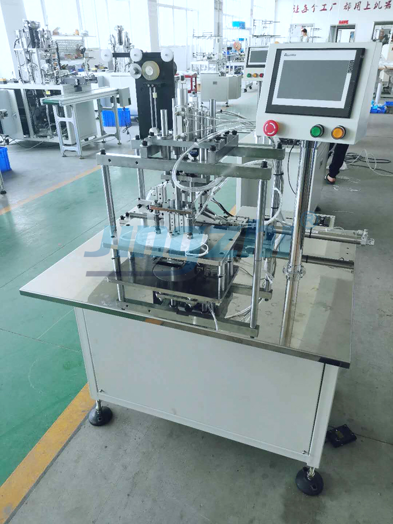1.N95片材放入工裝 2.踩下腳踏開關 3.單邊兩點同時焊接 4.旋轉(zhuǎn)后焊另外兩頭 |